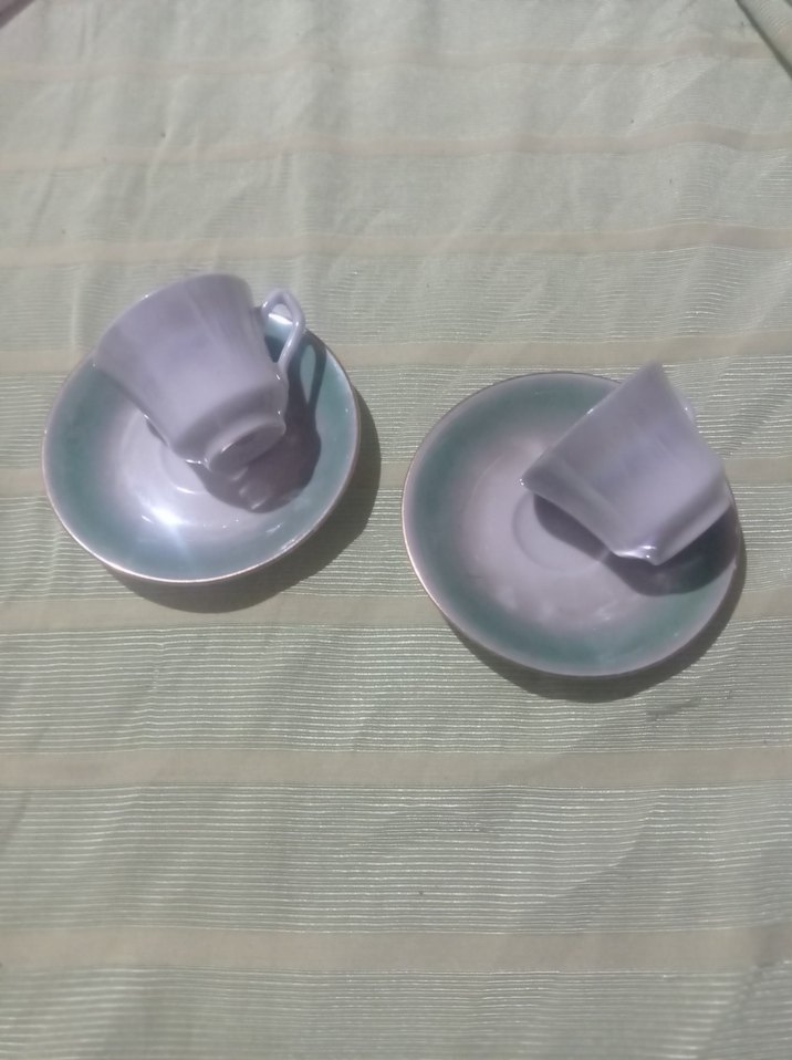 Pürüzsüz seramikten yapılmış, beyaz iki fincan ve uyumlu yeşil tabak seti. Günlük kullanım için şık ve sade tasarım. ☕
