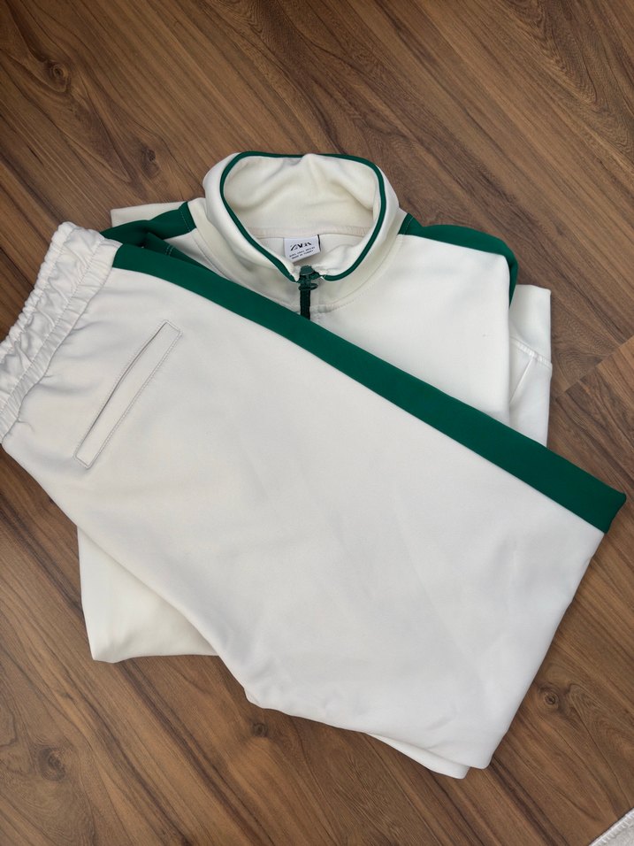 Kadınlar için beyaz renkli, yeşil şerit detaylı, yüksek yakalı ve uzun kollu eşofman takımı. Fermuarlı ve yumuşak, sıcak tutan kumaştan üretilmiştir. Günlük kullanım için uygundur. ♀️