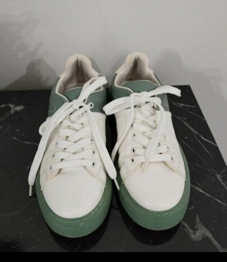 Beyaz ve pastel yeşil renkte, kauçuk tabanlı, spor ve sokak stili bir arada sunan kadın sneakers modeli.