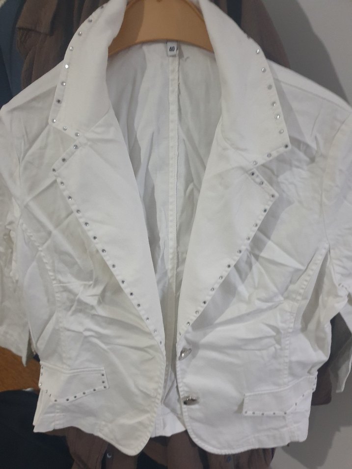 Beyaz, yetim kollu, yakası taşlı,düğmeli mini blazer. Parlak yüzeyi ve regular fit kesimiyle günlük sokak stiline uygundur.✨