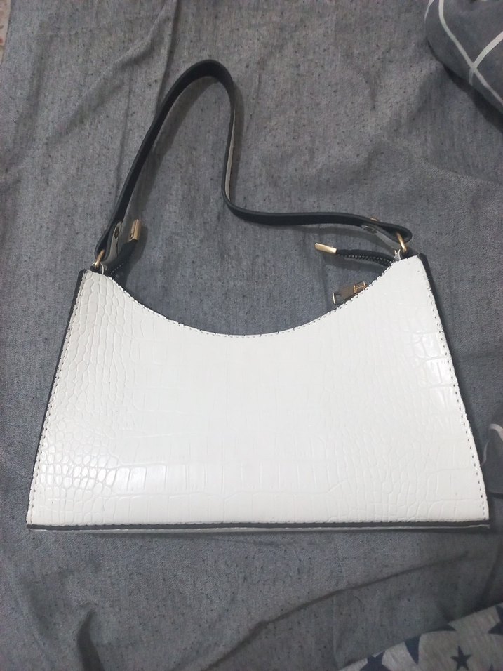 Beyaz yılan derisi desenli deri kadın çantası, tokalı askısı ve minimalist şıklığıyla günlük kullanıma uygundur.
