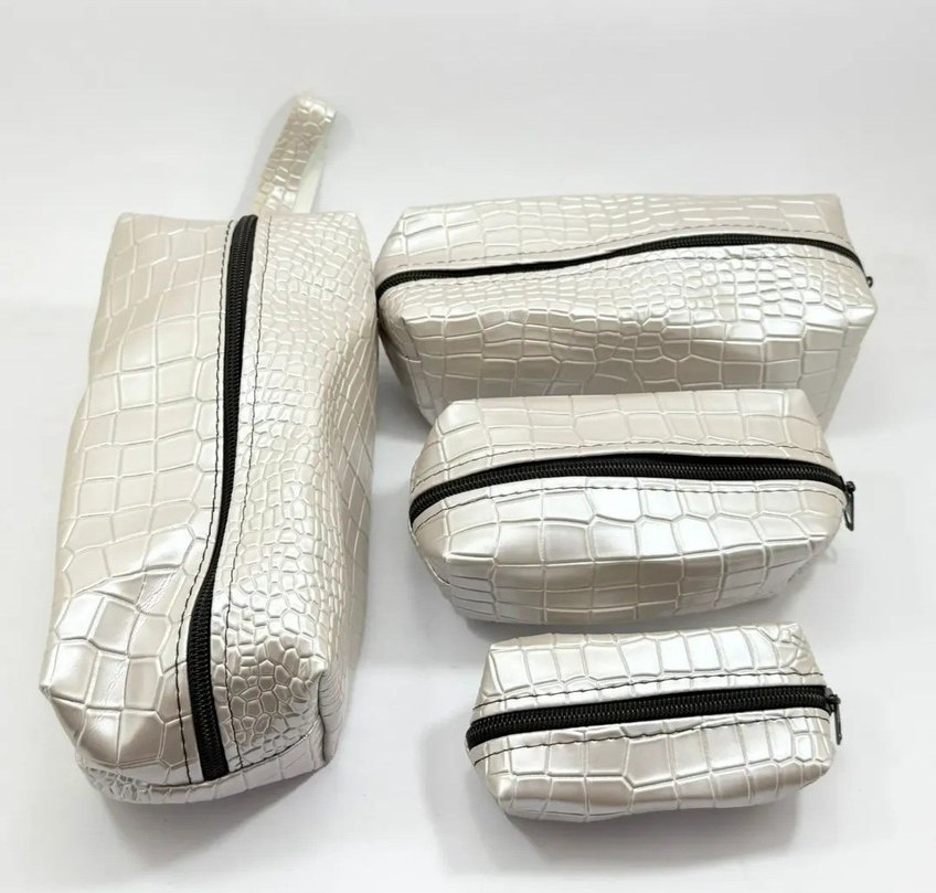 Beyaz yılan derisi desenli, fermuarlı, minimalist tarzda günlük kullanıma uygun deri makyaj çantası.