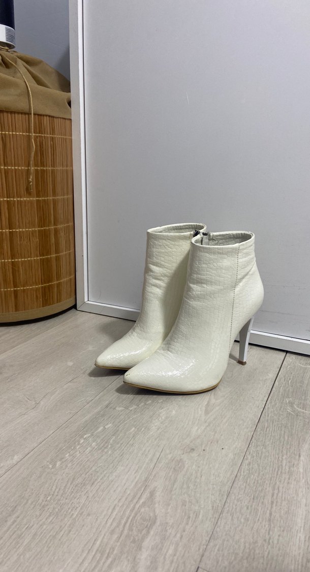 Yılan derisi desenli beyaz deri bilekte botlar, stiletto topuklu ve tokalı detaylara sahip. Günlük şıklık için uygundur.