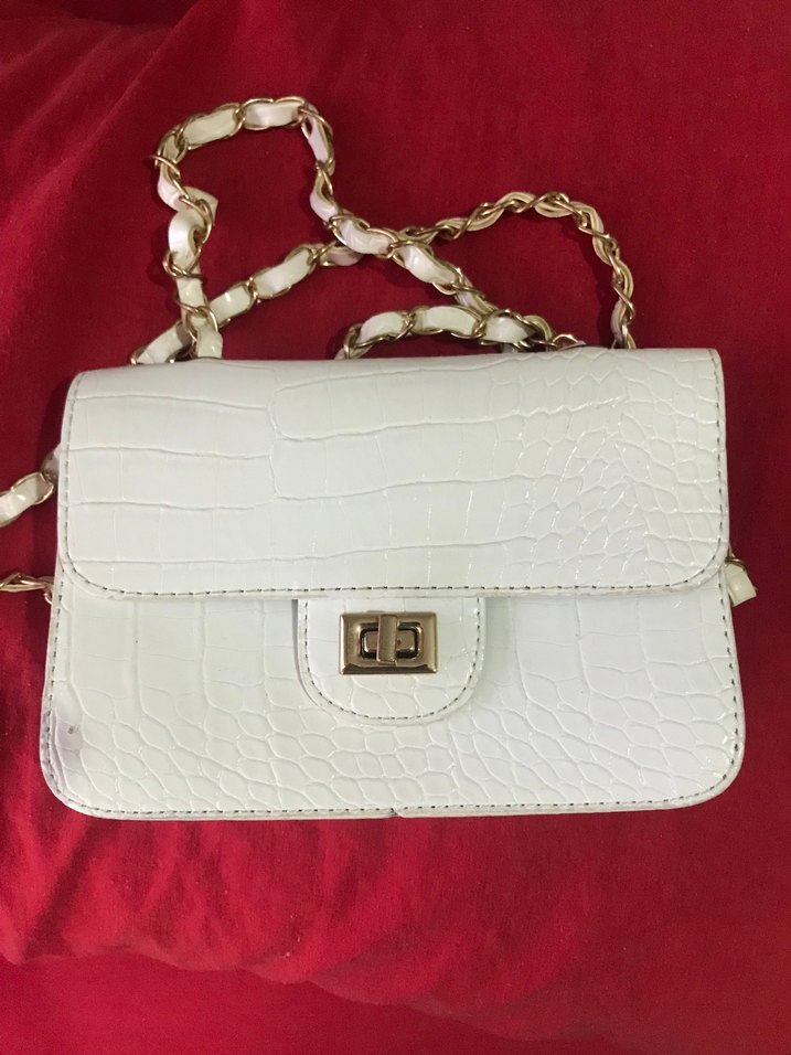 Beyaz Yılan Derisi Desenli Zincir Detaylı Kadın Çanta