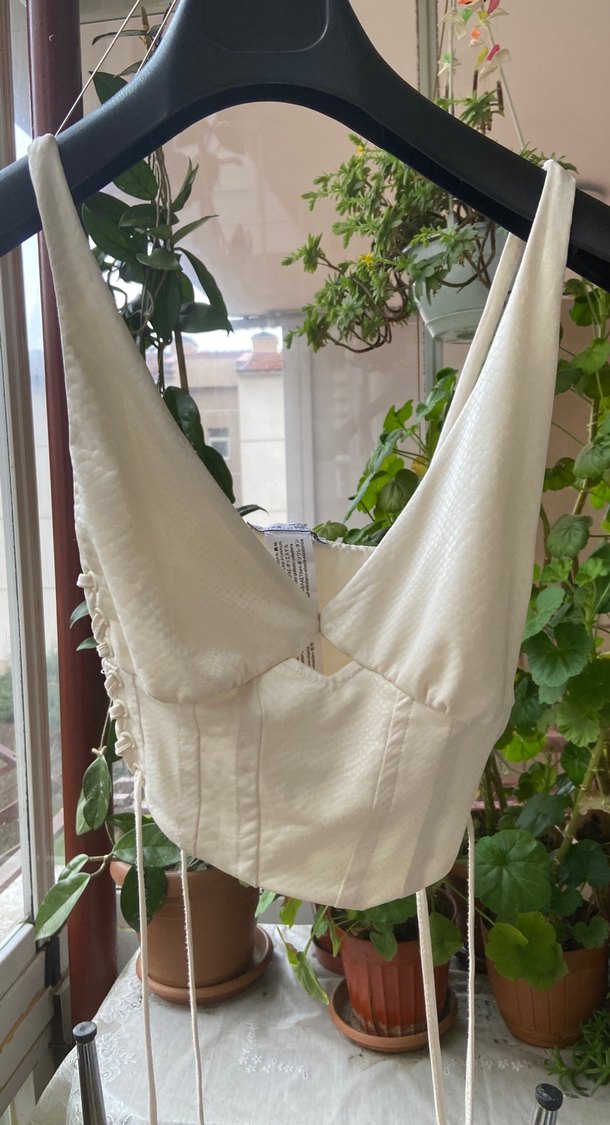 Beyaz keten, yılan desenli, V yakalı, drapeli, askılı ve normal uzunlukta dar kesim büstiyer. Outdoor sokak modasına uygun.