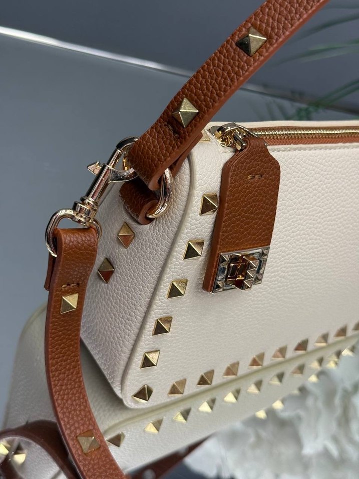 Beyaz yılan desenli deri çanta, altın renkli perçinlerle süslenmiştir. Fermuarlı ve kahverengi deri saplıdır, modern ve klasik tarzı birleştirir. VALENTINO GARAVANİ Rockstud Ölçüler : 21 cm x 12 cm A Kalite