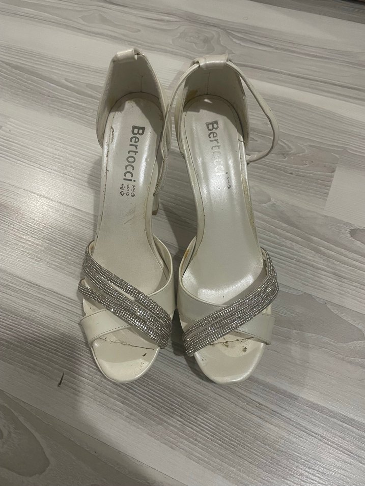 Beyaz yılan desenli dolgu topuklu kadın ayakkabısı, tokalı bantlarla. Bertocci marka, modern klasik stil, düğün için uygun.