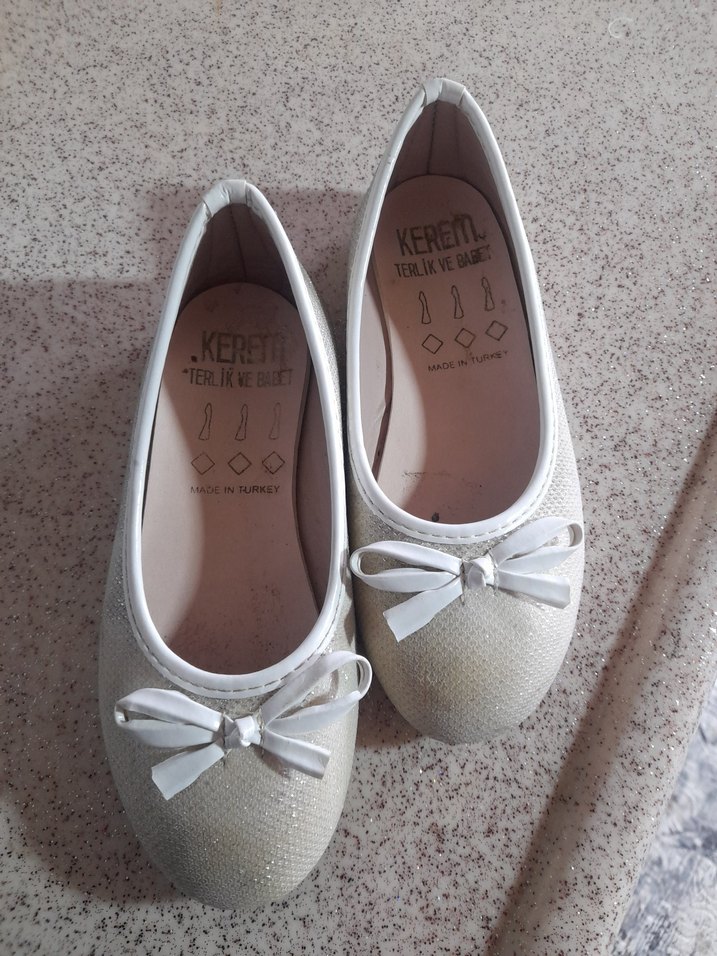 Beyaz yılan desenli, fiyonklu kız babeti, rahat kullanımlı kauçuk malzemeden üretilmiştir. Klasik şıklık sunar. Sadece bir kez özel bir davette giyilmiştir. Hiçbir yerinde yırtık, sökük veya büyük bir leke yoktur. İyi durumdadır, sadece iç tabanında hafif kararma mevcuttur.