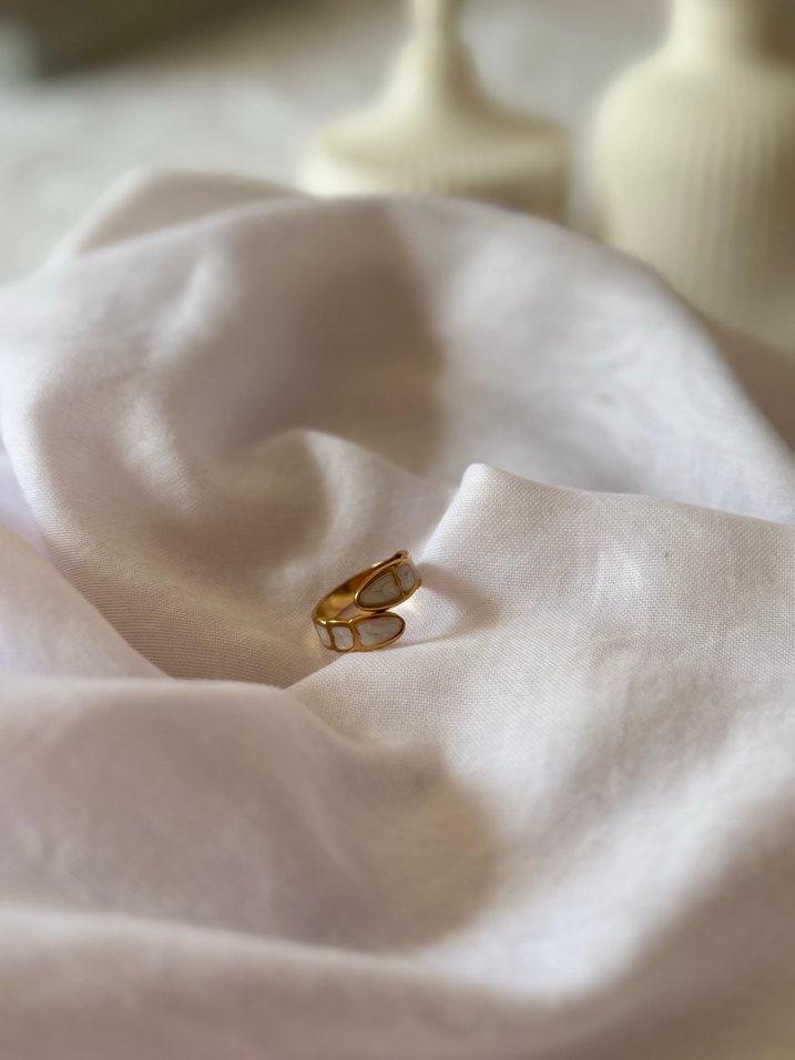 Beyaz yılan desenli, pliseli tasarıma sahip minimal kadın yüzük, klasik zarafet ve bohem stil için düğünlerde kullanıma uygun. Çelik üründür. Kararma yapmaz.