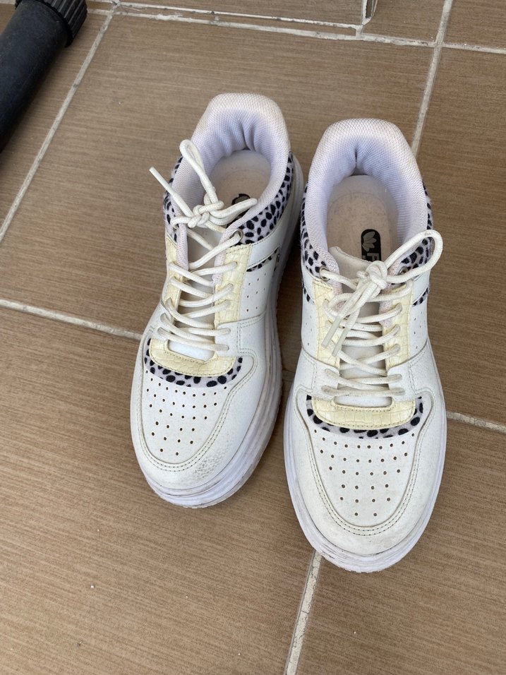 Beyaz yılan desenli, bağcıklı ve kauçuk tabanlı platform spor ayakkabı, günlük kullanım için uygundur.