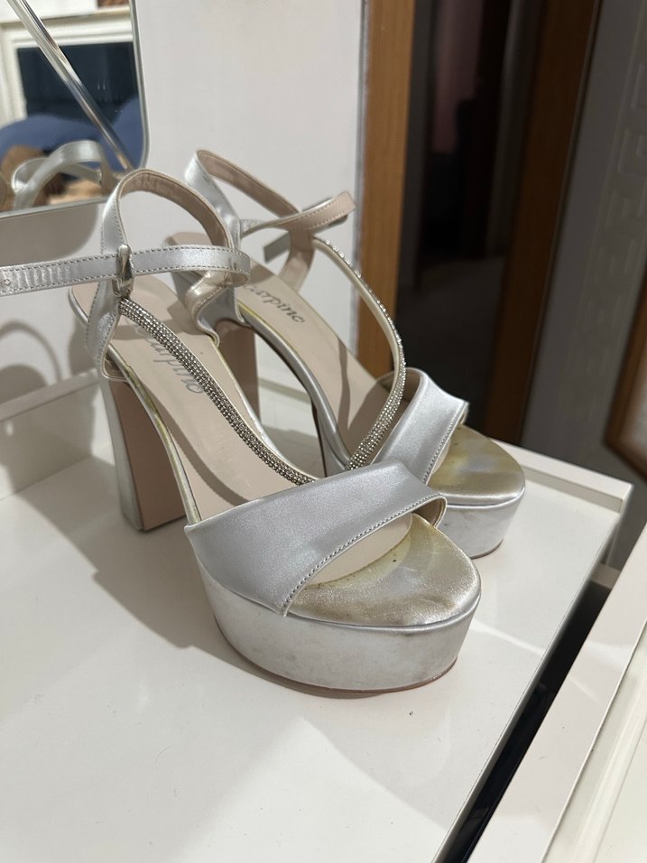 Gri yılan desenli beyaz platform topuklu, tokalı kayışlı, modern klasik stil ve göz alıcı şıklık sunar, düğünler için uygun. Sadece kınamda kullandım
