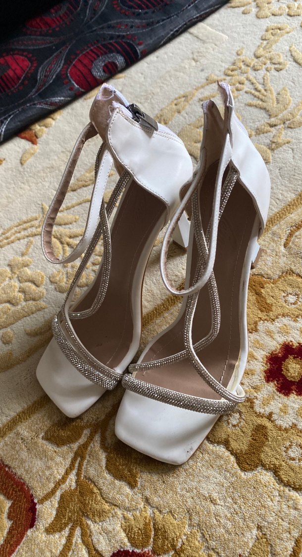Beyaz yılan desenli, tokalı stiletto topuklu ayakkabılar. Sentetik kumaştan yapılmış, parlak ve çağdaş tasarıma sahip, düğün gibi özel anlar için uygun.