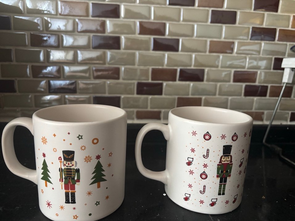 Renkli yılbaşı temalı baskılara sahip beyaz kupalar. İçinde asker, ağaç ve diğer süslemeler yer alıyor.