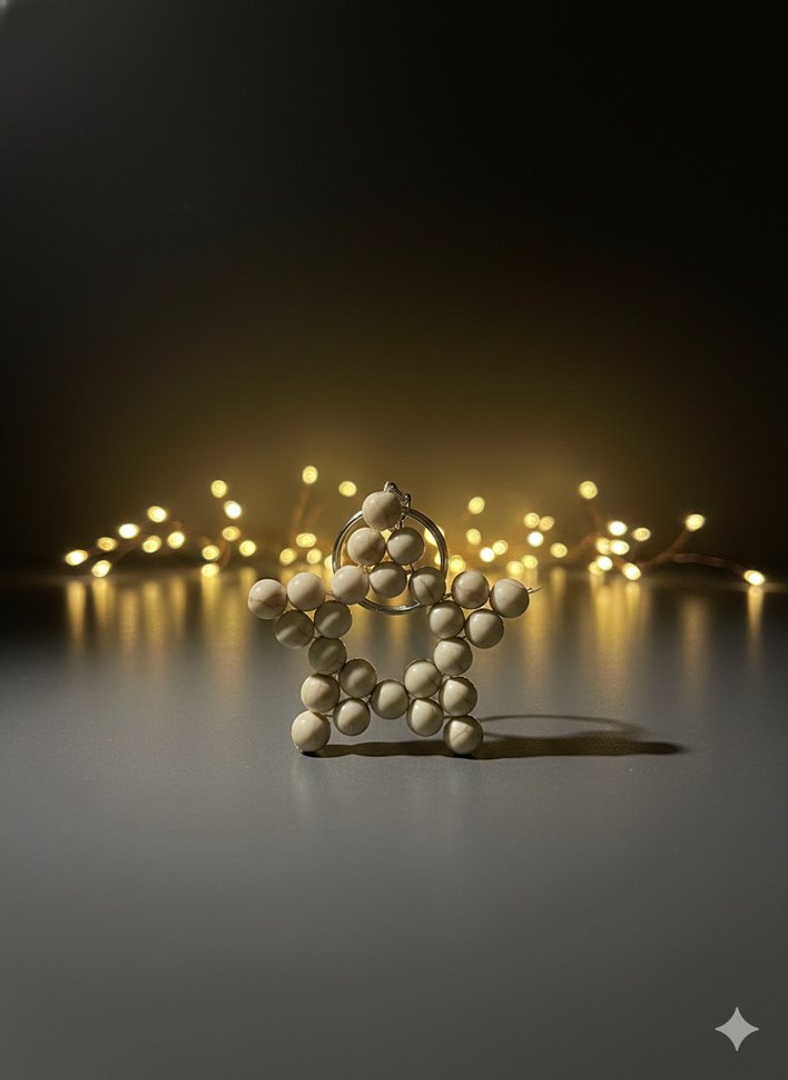 Beyaz yuvarlak boncuklardan yapılmış yıldız şeklinde dekoratif bir figür. Hafif ve doğal görünüme sahip, ortama zarif bir dokunuş katar.