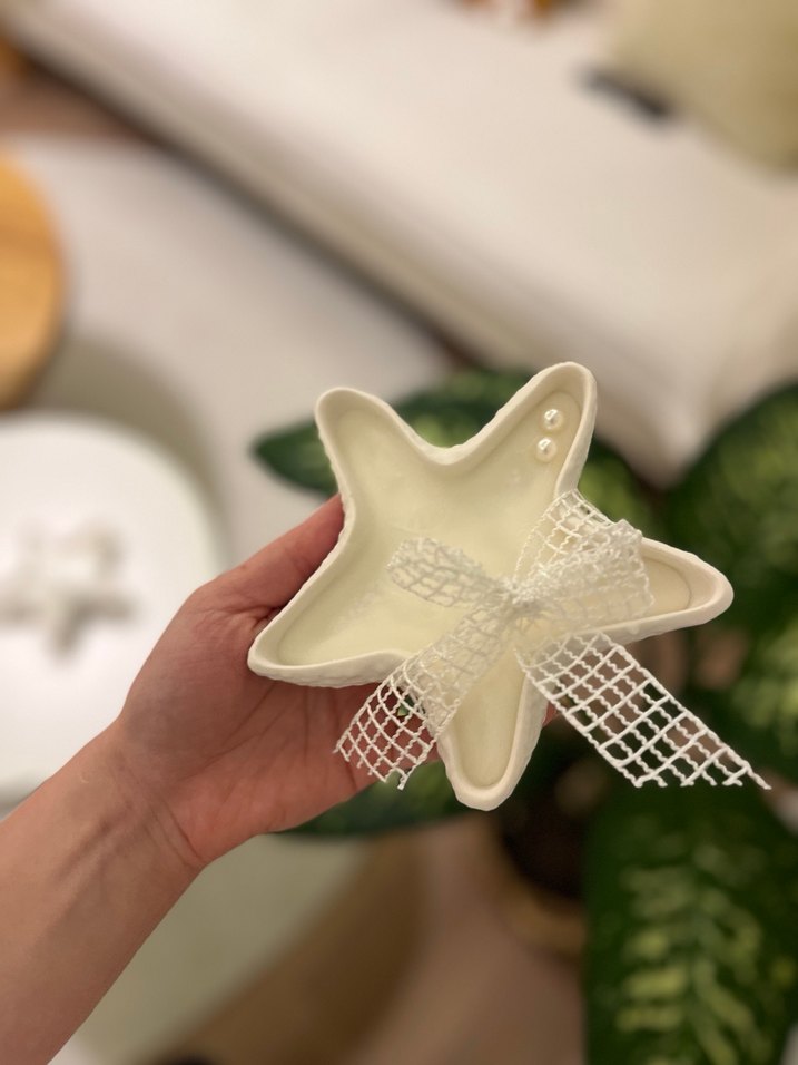 Bu beyaz yıldız şeklindeki mumluk, ince örgü fiyonk ve iki küçük inci detayıyla hafif dekor için uygun. ️tane fiyatıdır