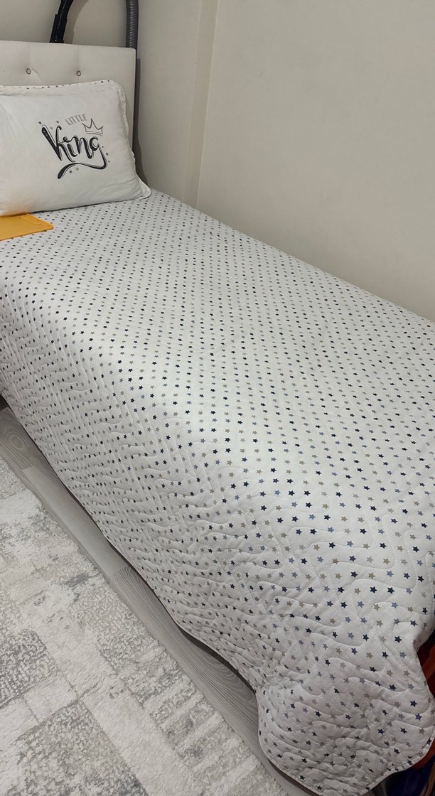 Küçük yıldızlı renkli beyaz yatak örtüsü, çift taraflı yatağa sade ve şık bir dokunuş katıyor. ️tek kişilik