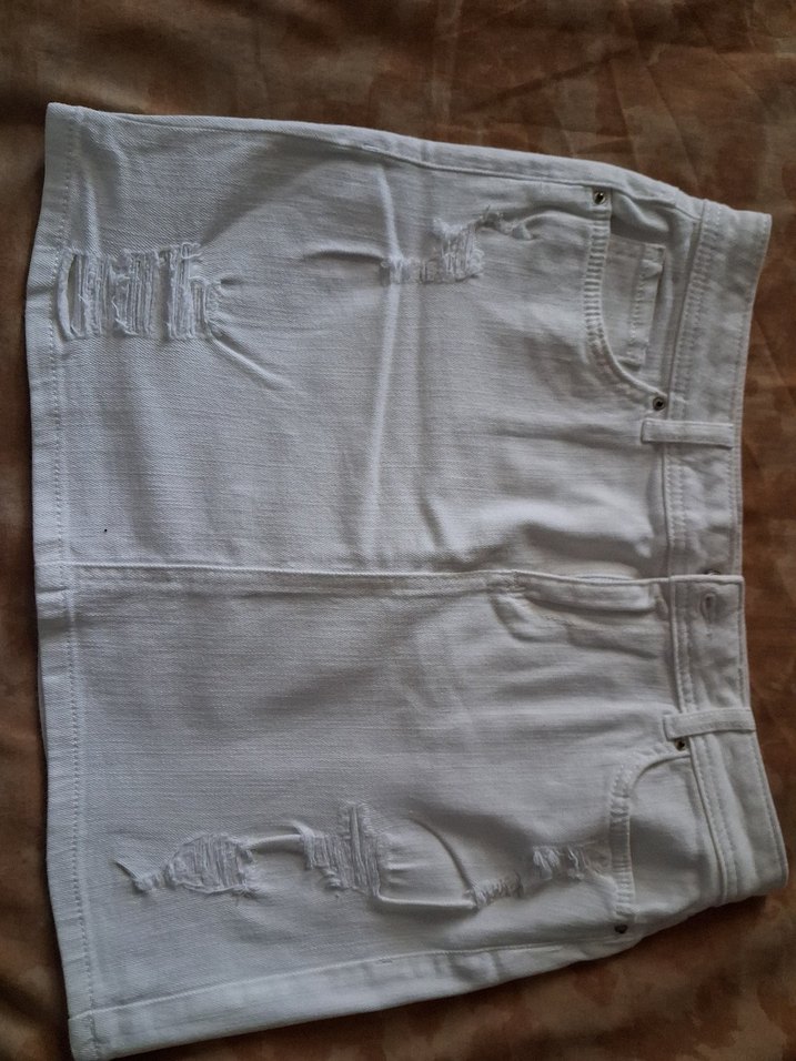 Beyaz renkli, yırtık detaylara sahip bol kesim jean mini etek. Rahat ve günlük sokak stiline uygun.