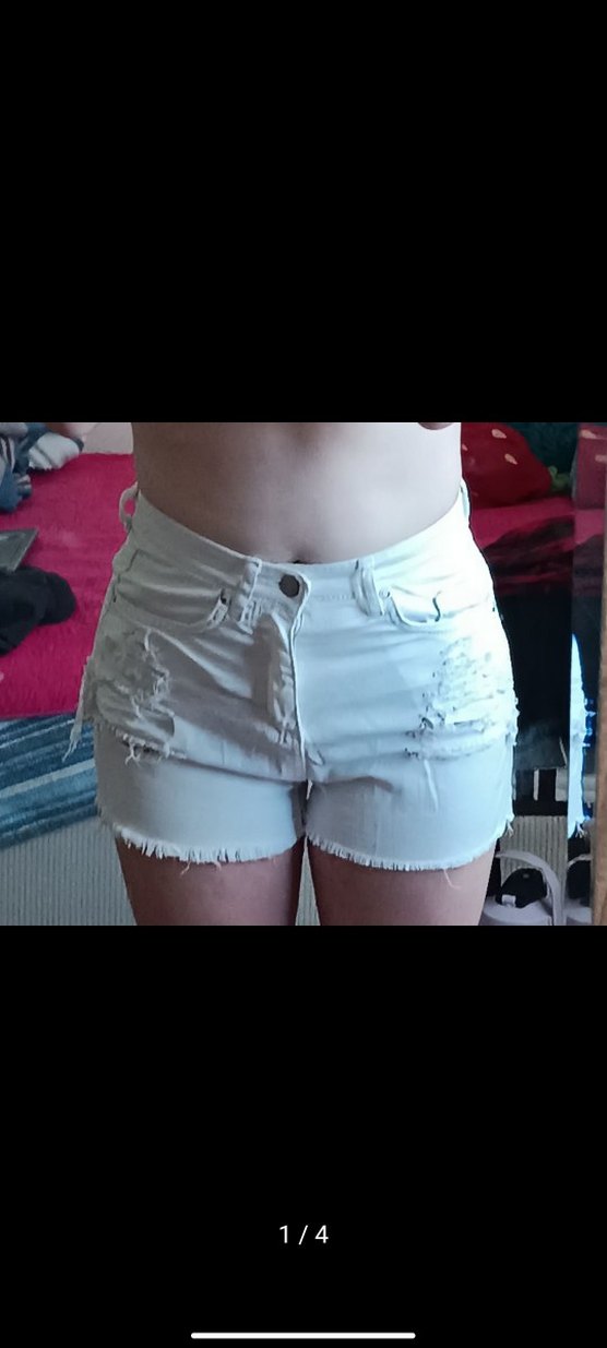 Beyaz renkli, düğmeli ve yırtık detaylı mini denim şort, günlük rahat sokak tarzı için uygundur. giyilmedi