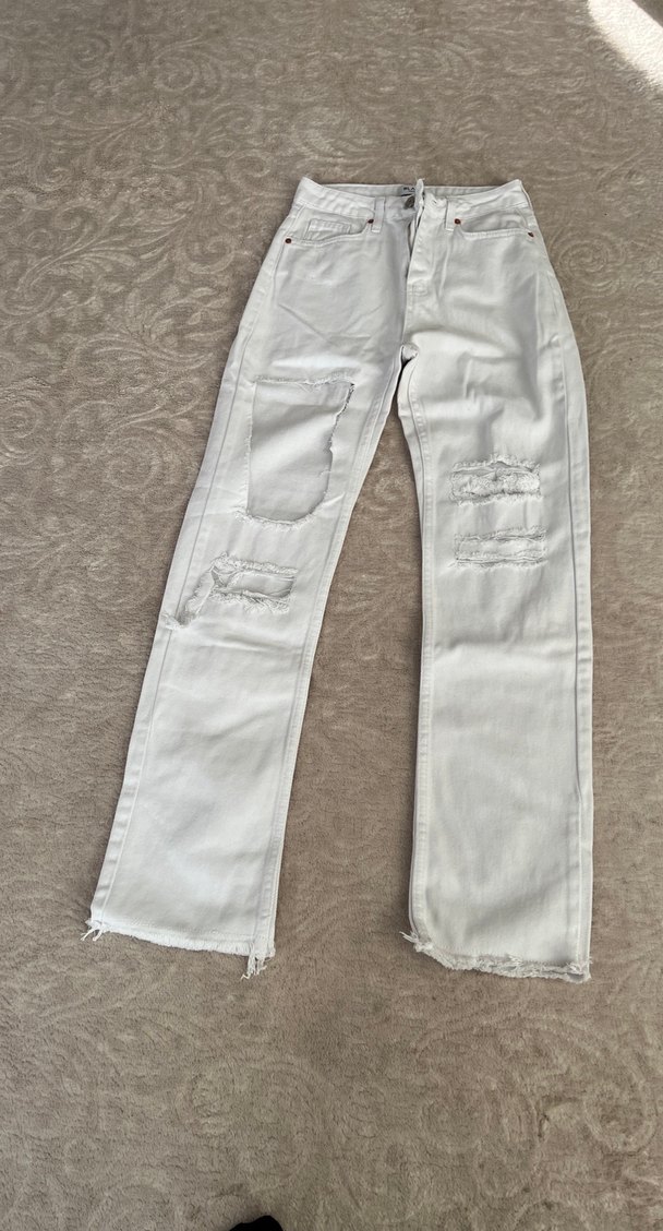 Beyaz denim kumaştan yapılmış, yırtık detaylı ve paça ucu hırpalanmış regular fit jean. Günlük sokak stiline uygun bir parça.