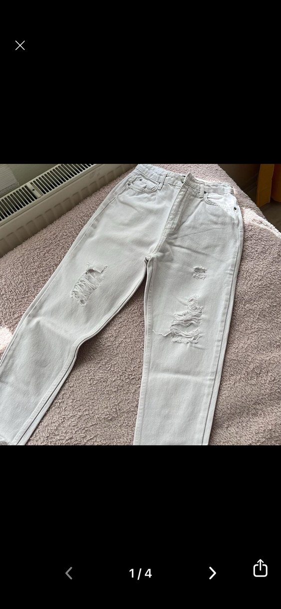 Yırtık detaylı, salaş kesim beyaz denim jean. Günlük kullanım için rahat ve şık bir sokak stili sunar.