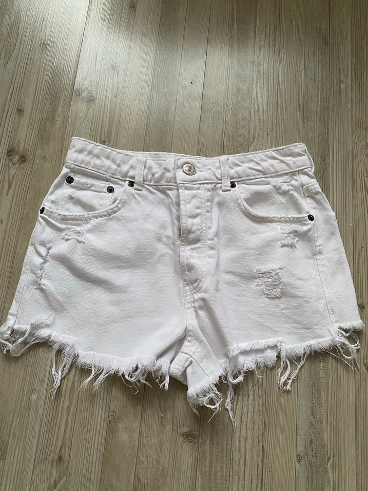 Beyaz kot şort, bol kesim ve yırtık detaylı kenarlarıyla rahat ve şık bir görünüm sunar. Günlük kullanım için uygundur.