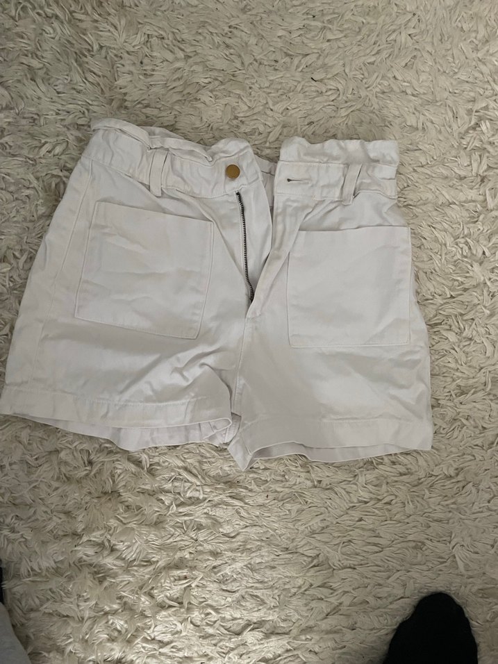 Beyaz yüksek bel mini şort, pamuklu yumuşak kumaştan, bol kesim ve büyük ön ceplerle rahat sokak stili için uygundur. Günlük kullanım için ideal.