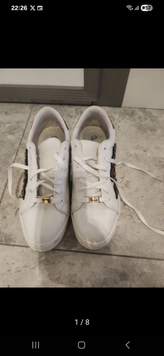 Beyaz kadın spor ayakkabısı, yüksek kauçuk topuklu ve yılan desenli detaylara sahip. Cırt cırtlı bantları ve parlak görünümüyle günlük kullanıma uygun.