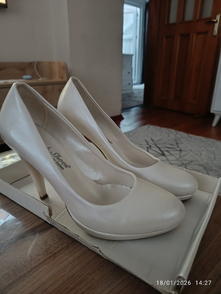 Düğün ve iş ortamları için uygun, modern klasik tarzda beyaz yüksek topuklu stiletto. Düz yüzeyi ve zahmetsiz şıklığı ile öne çıkar.