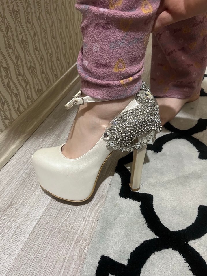 Sentetik kumaştan yapılmış, parlak yılan desenli ve pul işlemeli beyaz yüksek topuklu abiye ayakkabı. Düğünler için gotik ve göz alıcı tarzda.