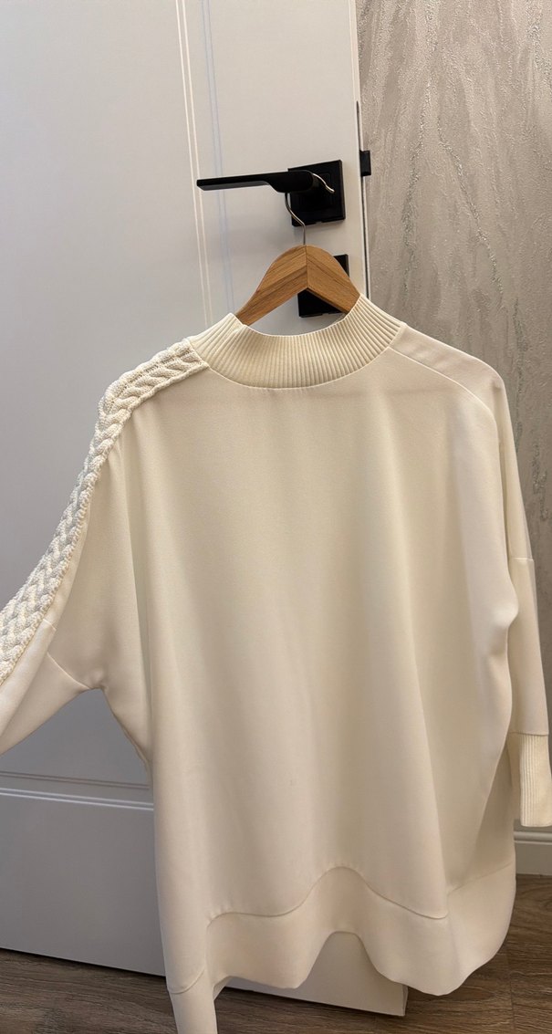 Beyaz renkte, yüksek yakalı ve uzun kollu örgü detaylı kadın kazak. Rahat kesimi ve örgü kumaşıyla konforlu ve şık bir sokak giyimi tarzı sunar.