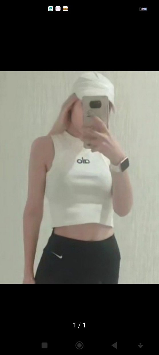 Beyaz, yüksek yakalı ve kolsuz, vücuda oturan crop top. Spor ve günlük sokak tarzı için uygun, önünde "olo" logosu bulunur. ♀️