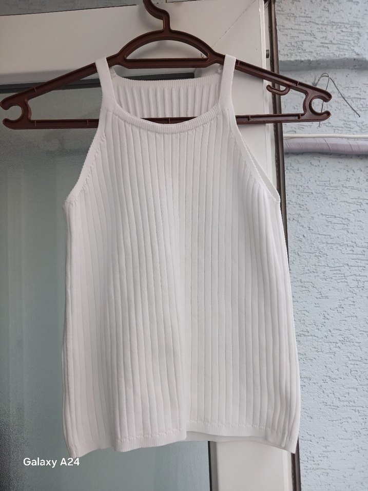 Beyaz renk, yüksek yakalı, kısa ve vücuda oturan örme kumaştan üretilmiş, minimal ve sade stil sunan kolsuz bir atlet. Günlük sokak giyimine uygun.