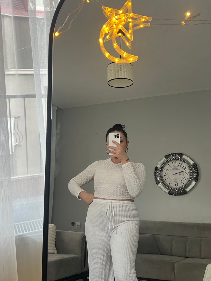 Beyaz Yüksek Yakalı Fitilli Kadın Kazak