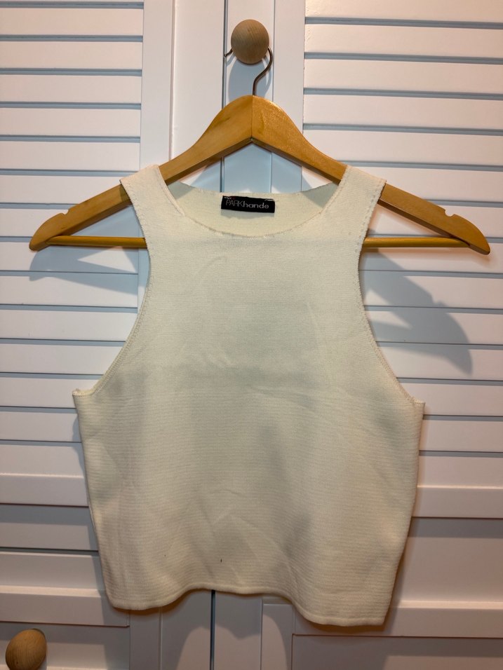 Pamuk kumaştan, beyaz renkte ve yüksek yakalı, kolsuz, vücuda oturan kesime sahip minimalist tarzda kadın atlet. Günlük sokak giyimine uygun. Boy 42 cm en 36 cm