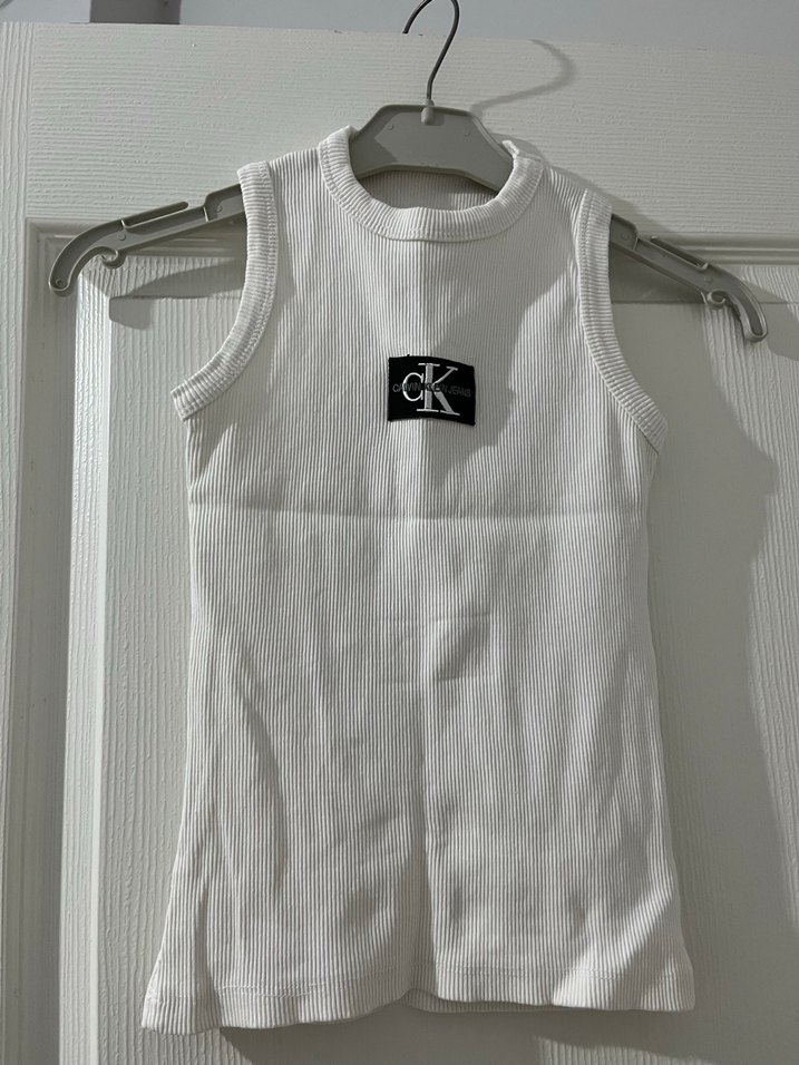 Pamuklu, beyaz, yüksek yakalı ve kolsuz crop top. Minimalist tasarımda, göğüste küçük CK logo detayına sahip, günlük sokak stiline uygun. Bir iki kere giyilmiştir. S M bedendir