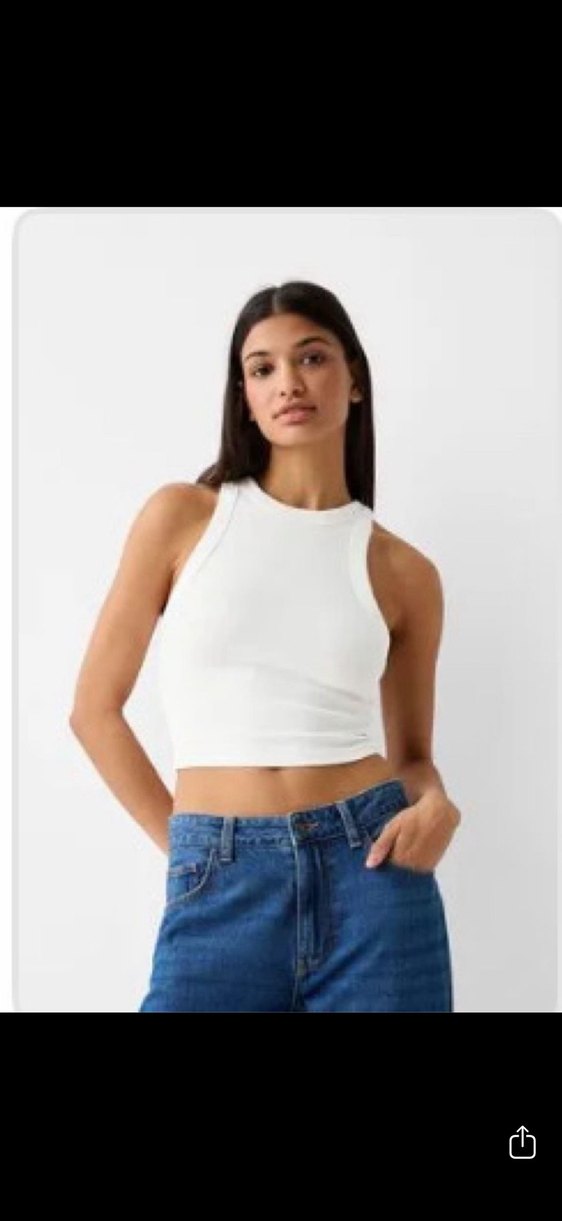 Denim kumaştan, yüksek yakalı ve kolsuz, beyaz renkli, vücuda oturan crop top. Günlük kullanım için uygun, sokak stiliyle uyumlu. Aynı üründen iki tane var bu nedenle iki kez yükledim.
