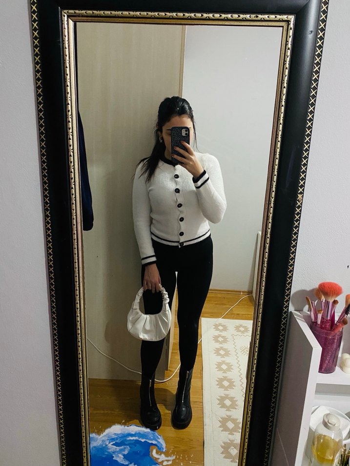 Beyaz, yüksek yakalı, uzun kollu ve siyah detaylı, deri görünümlü, midi boy hırka. Günlük kullanıma uygun şık ve rahat bir parça.