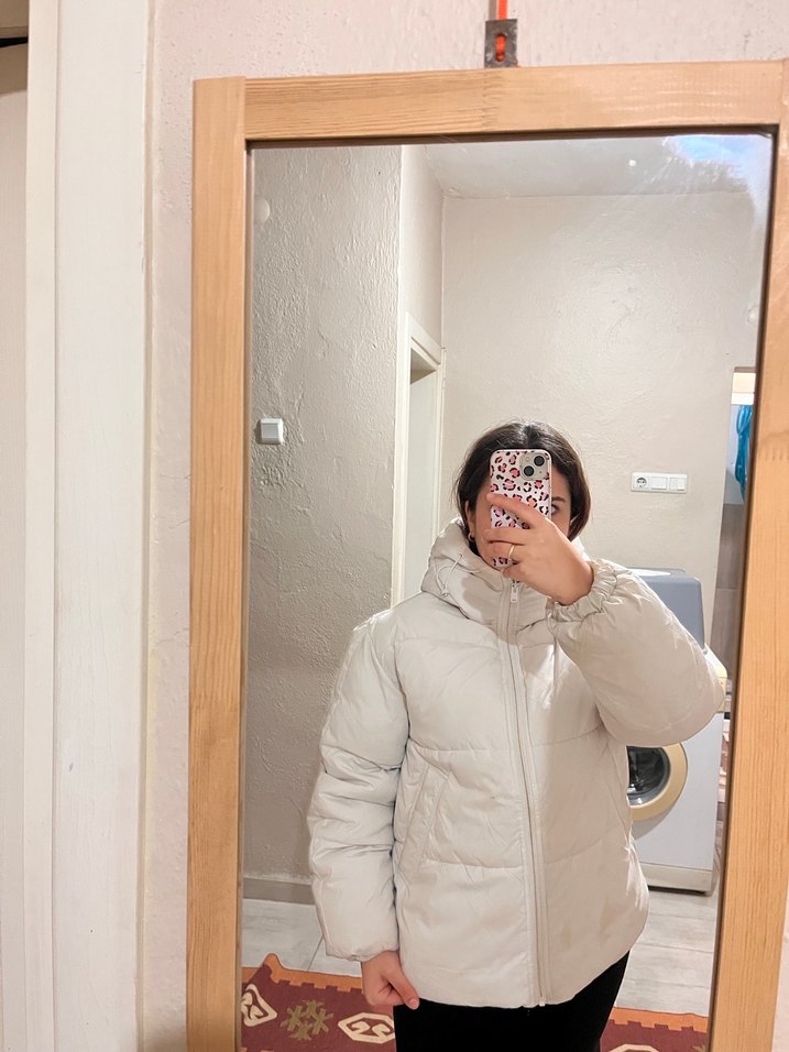 Beyaz, yüksek yakalı kadın mont, uzun kollu ve puff detaylıdır. Midi boyda, yumuşak ve sıcak kumaşıyla günlük kullanıma uygundur. ❄️