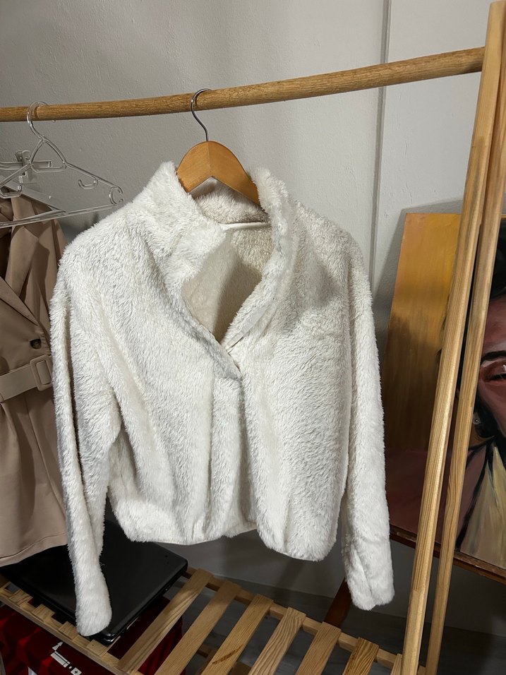 Yüksek yakalı ve uzun kollu kadın sweat, yumuşak ve sıcak kumaştan, kürk detaylıdır. Salaş kesim ve normal boydadır, günlük rahat kullanıma uygundur. Desensiz ve beyaz renktedir.