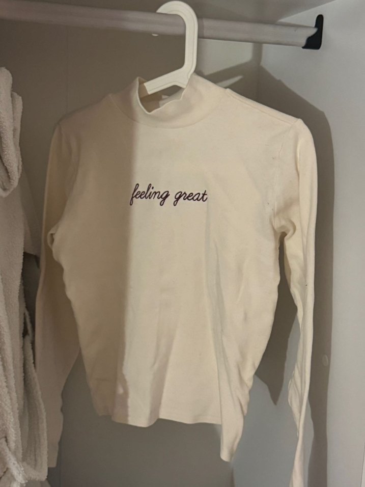 Beyaz renkte, yüksek yakalı ve uzun kollu, yumuşak örme kumaştan yapılmış dar kesim kadın kazak. Önünde "feeling great" baskısı bulunur.