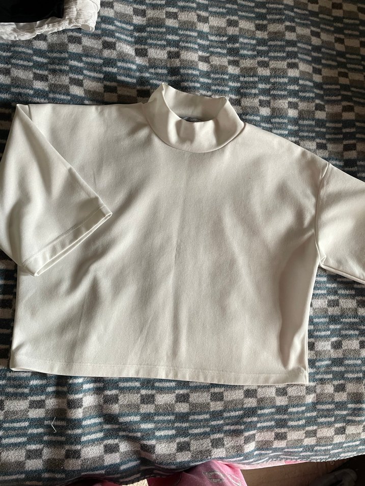 Beyaz renkte, yüksek yakalı ve kısa kollu bu kadın tişörtü, salaş kesimi ve yumuşak, sıcak dokusuyla günlük kullanım için uygundur.