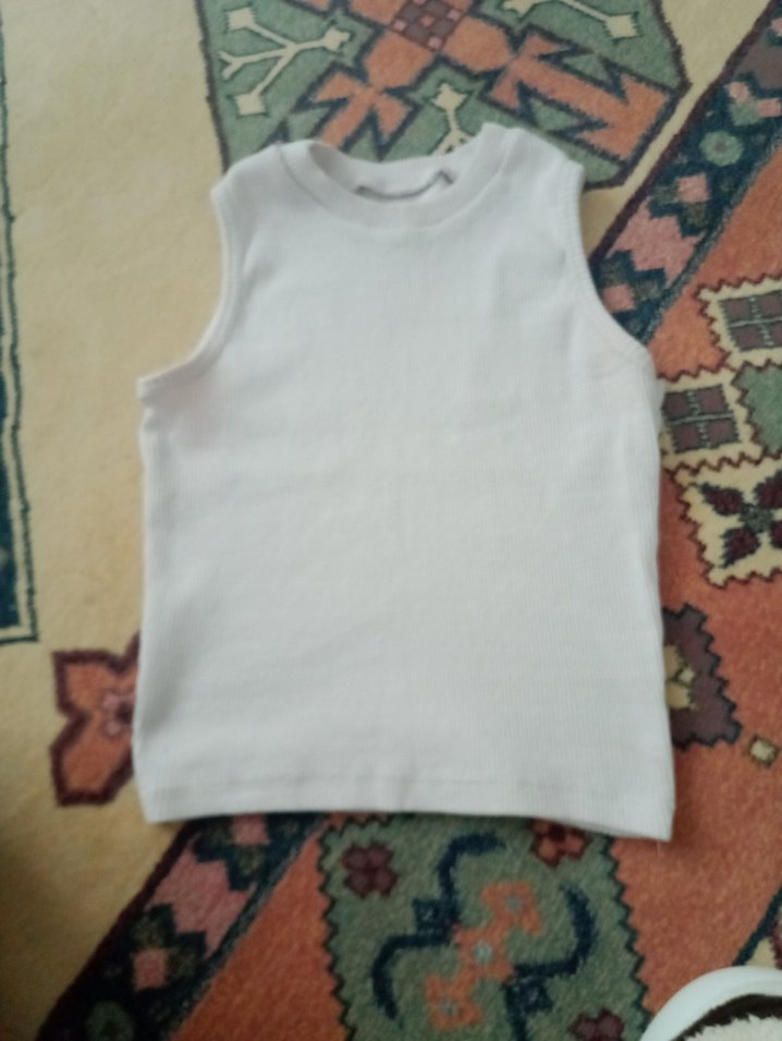 beyaz yüksek yakalı, kolsuz ve normal boyda kadın atlet. Rahat dokusu ve sade tasarımıyla günlük sokak stiline uyum sağlar.