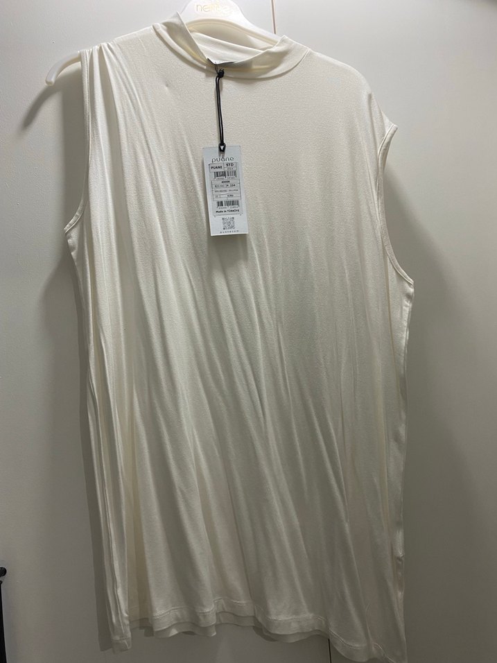 Beyaz, yüksek yakalı, kolsuz ve midi uzunlukta, rahat kesimli ipeksi kumaştan yapılmış bluz. Minimalist tarzda günlük sokak giyimine uygundur. ✨ penye içlik standart beden 44 bedene kadar olur