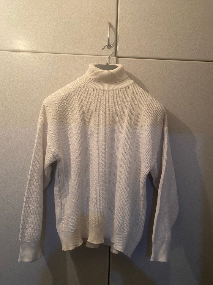 Beyaz renkli, yüksek yakalı ve uzun kollu örgü kadın kazak. Rahat ve bol kesimiyle günlük kullanıma uygundur. Minimalist ve desensiz tasarım.