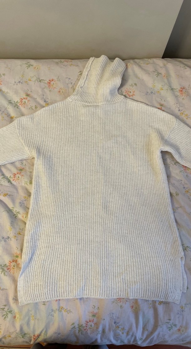 Beyaz örgü kumaştan yapılmış, yüksek yakalı ve uzun kollu, bol kesim kadın kazak. Midi boyunda, desen içermeyen rahat ve şık bir günlük kazak.