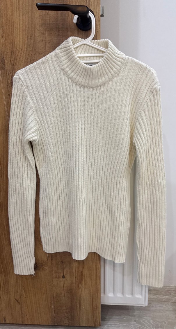 Yumuşak örgü kumaştan, yüksek yakalı ve uzun kollu, beyaz, düz ve normal uzunlukta, vücuda oturan kadın kazak. Günlük kullanım için uygundur.