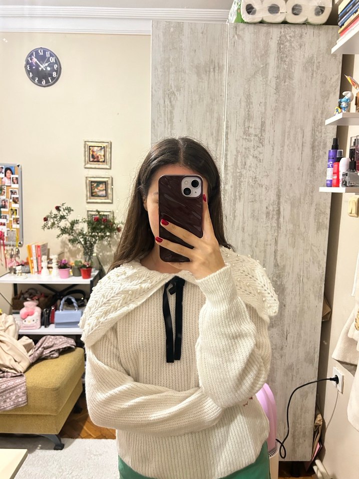 Beyaz, yüksek yakalı omuzlari inci detayli ve uzun kollu örgü kumaştan yapılmış, günlük sokak stili için uygun, vücuda oturan rahat kazak.