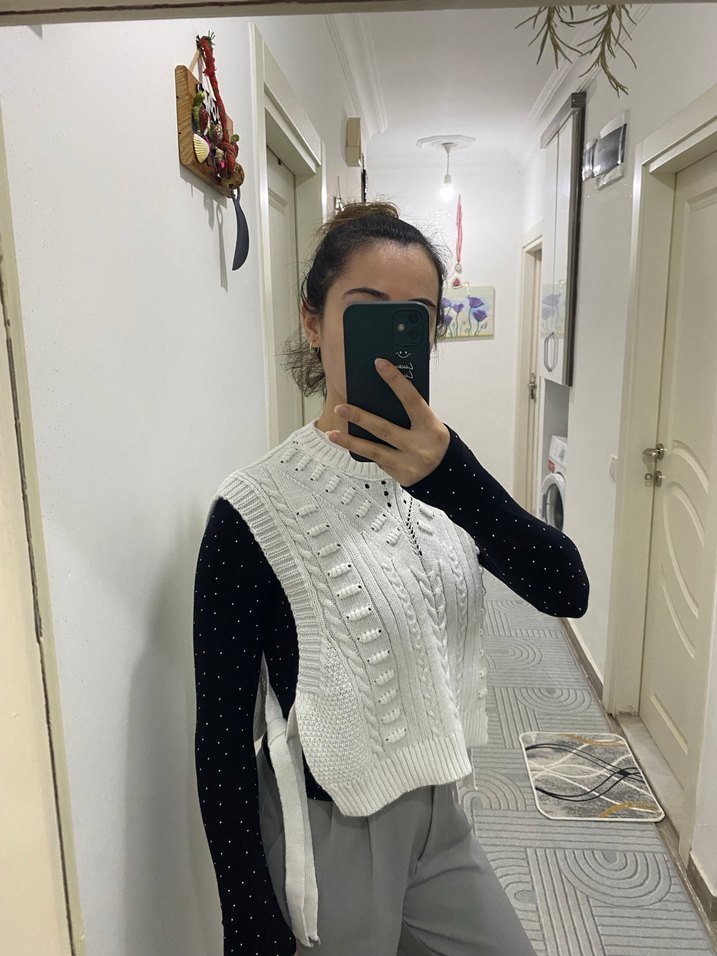 Beyaz, yüksek yakalı, örgü dokulu, vücuda oturan, kolsuz triko süveter. Midi boyda ve günlük kullanıma uygun rahat bir model.