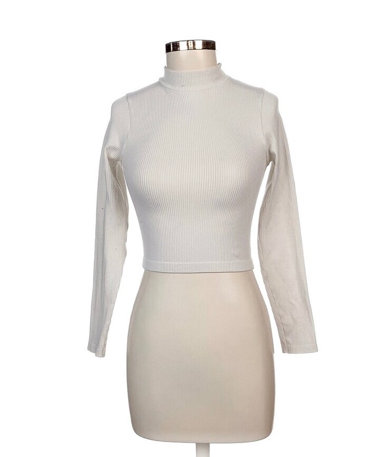 Beyaz, yüksek yakalı ve uzun kollu pamuklu crop. Minimalist ve normcore tarzıyla günlük kullanıma uygundur.