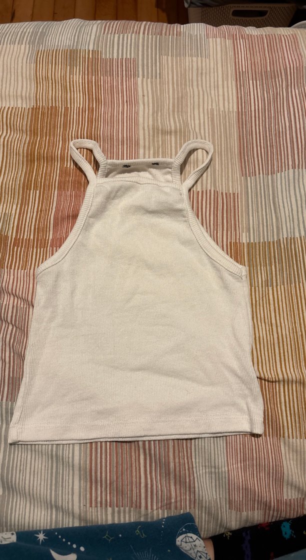 Beyaz renkli, pamuklu kumaştan yapılmış kadın crop. Yüksek yakalı halter yaka gibi, kolsuz ve vücuda oturan kesime sahip. Günlük sokak stili için uygun, sade ve şık bir parça. Bi kusuru yok ölçüler fotoda var kumaş esniyor. S-M uyumludur.